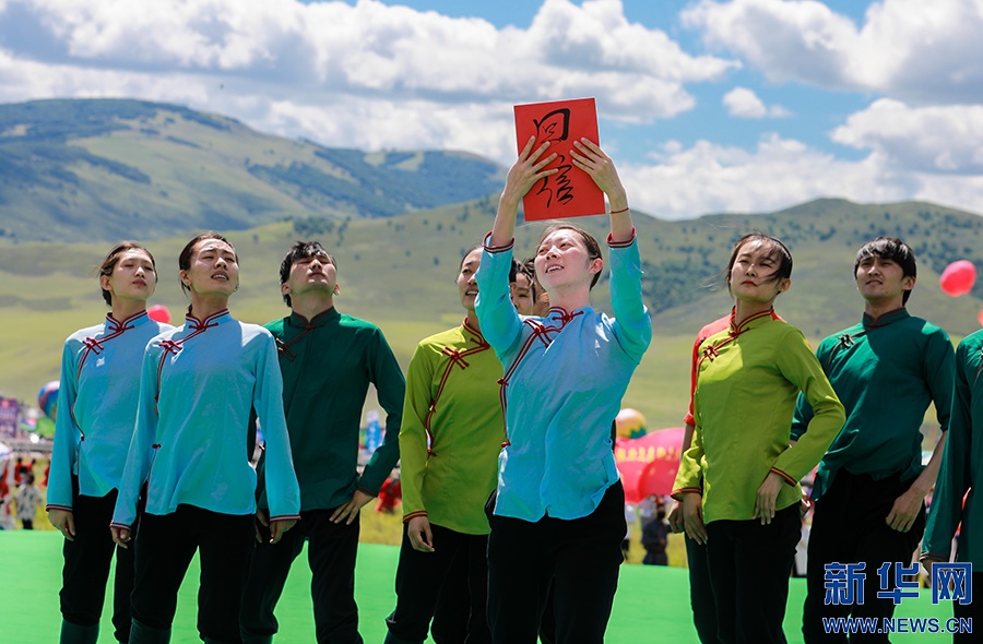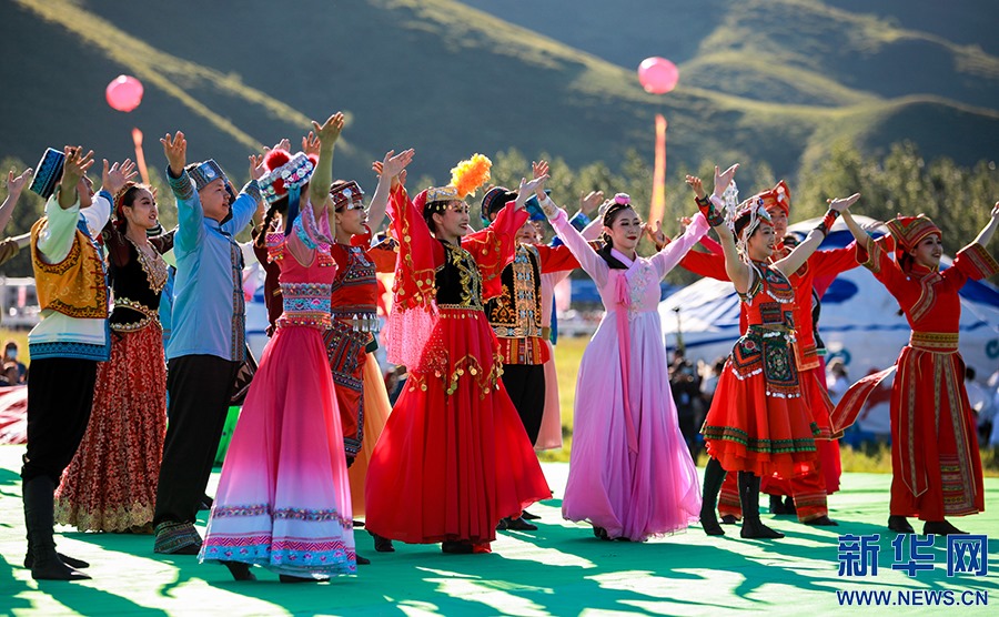 8月8日,烏蘭牧騎隊員們在開幕式上進行文藝表演。新華網(wǎng)發(fā)(丁根厚攝)