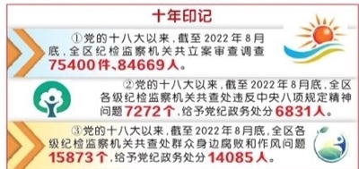 數(shù)據(jù)顯示,黨的十八大以來,截至2022年8月底,全區(qū)紀檢監(jiān)察機關立案審查調查75400件、84669人,做到有腐必反、除惡務盡,推動政治生態(tài)持續(xù)向上向好。