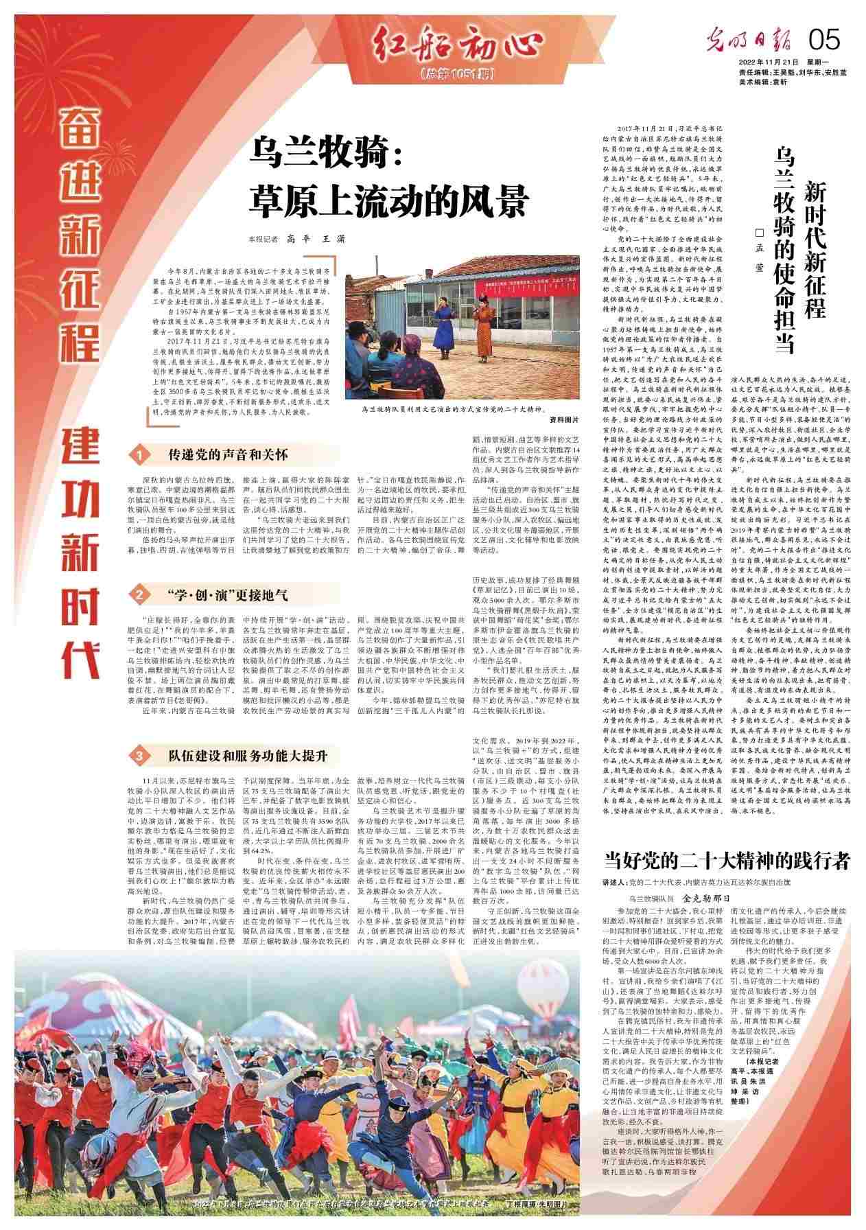 2017年11月21日,習(xí)近平總書記給蘇尼特右旗烏蘭牧騎的隊(duì)員們回信,勉勵他們大力弘揚(yáng)烏蘭牧騎的優(yōu)良傳統(tǒng),扎根生活沃土,服務(wù)牧民群眾,推動文藝創(chuàng)新,努力創(chuàng)作更多接地氣、傳得開、留得下的優(yōu)秀作品,永遠(yuǎn)做草原上的“紅色文藝輕騎兵”。5年來,總書記的殷殷囑托,激勵全區(qū)3500多名烏蘭牧騎隊(duì)員牢記初心使命、根植生活沃土,守正創(chuàng)新、踔厲奮發(fā),不斷創(chuàng)新服務(wù)形式,送歡樂、送文明,傳遞黨的聲音和關(guān)懷,為人民服務(wù)、為人民放歌。