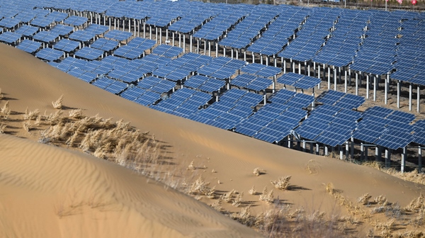 在鄂爾多斯市達(dá)拉特旗昭君鎮(zhèn)柴磴嘎查,346萬塊藍(lán)色光伏板隨著綿延的庫布其沙漠起伏,像陣陣波濤,在漫漫沙海中匯成3000萬平方米的光伏“海洋”。走在3米高的光伏架下,達(dá)拉特旗委書記張秀玲高興地介紹:“這里種的是1.2萬畝紅棗,那邊是5000畝黃芪和黃芩,更遠(yuǎn)處是1.9萬畝的優(yōu)質(zhì)牧草。沙窩里種上作物,再從上面架起光伏板,相當(dāng)于打了兩層‘保護(hù)傘’,黃沙休想亂跑?!?/p>