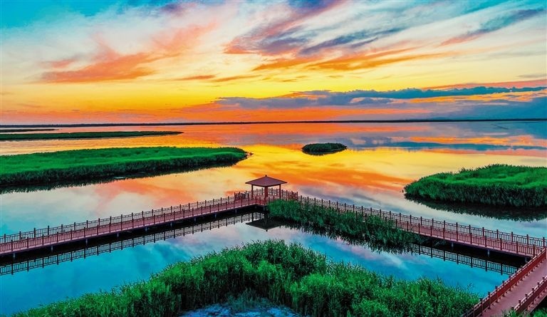 晚霞映襯下的烏梁素海美不勝收。