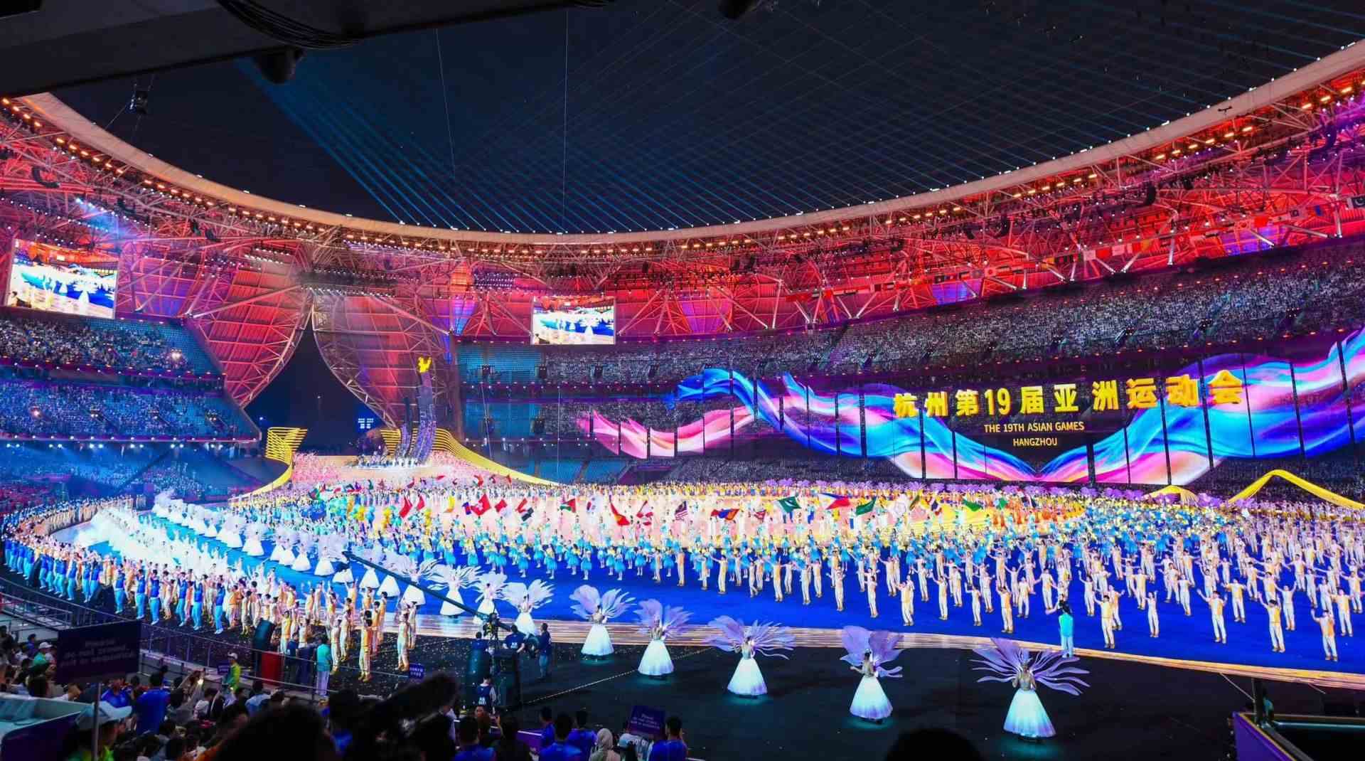 開(kāi)幕式文藝表演以“潮起亞細(xì)亞”為總主題,分為《國(guó)風(fēng)雅韻》《錢(qián)塘潮涌》《攜手同行》三大篇章,寓意著新時(shí)代的中國(guó)正與亞洲、世界交融激蕩,像浪潮一樣奔涌向前。開(kāi)幕式首次將3D雙威亞技術(shù)應(yīng)用于大型運(yùn)動(dòng)場(chǎng)中,首次實(shí)現(xiàn)“數(shù)實(shí)融合”點(diǎn)火儀會(huì)開(kāi)幕式在浙江省杭州市隆重舉行。開(kāi)幕式文藝表演以“潮起亞細(xì)亞”為總主題,分為《國(guó)風(fēng)雅韻》《錢(qián)塘潮涌》《攜手同行》三大篇章,寓意著新時(shí)代的中國(guó)正與亞洲、世界交融激蕩,像浪潮一樣奔涌向前。開(kāi)幕式首次將3D雙威亞技術(shù)應(yīng)用于大型運(yùn)動(dòng)場(chǎng)中,首次實(shí)現(xiàn)“數(shù)實(shí)融合”點(diǎn)火儀式。本次亞運(yùn)會(huì)有來(lái)自亞洲45個(gè)國(guó)家和地區(qū)代表團(tuán)的1.2萬(wàn)多名運(yùn)動(dòng)員報(bào)名參賽,共設(shè)40個(gè)大項(xiàng)、61個(gè)分項(xiàng)、481個(gè)小項(xiàng),是史上規(guī)模最大、項(xiàng)目最多、覆蓋面最廣的一屆亞運(yùn)會(huì)。