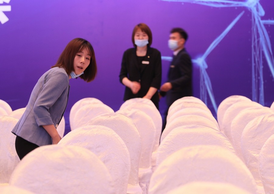 會(huì)場(chǎng)基本布置完畢,工作人員正在進(jìn)行流程彩排