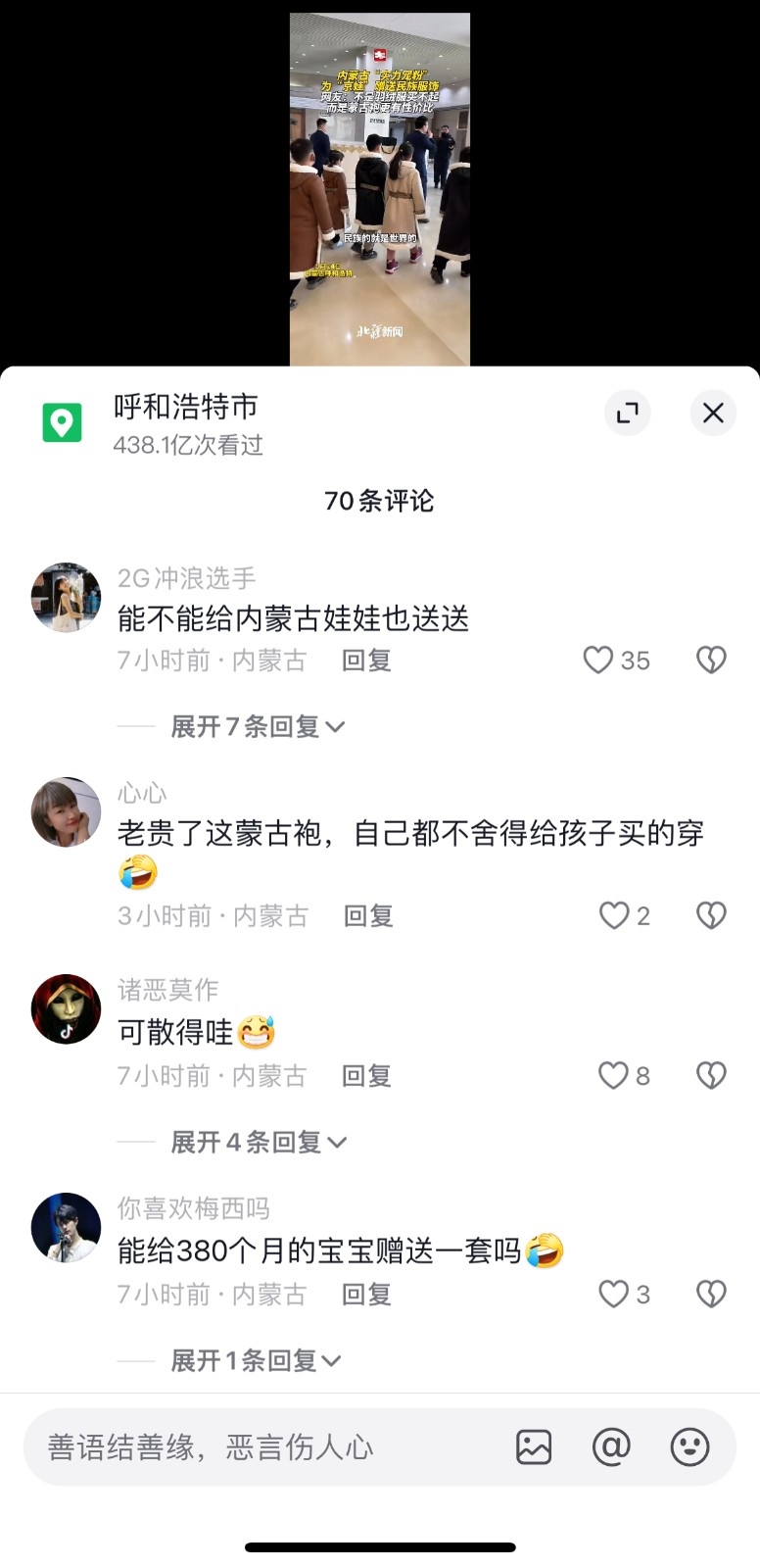 內蒙古為了招待北京來的萌娃們,直接送了溫暖的蒙古袍,對于這些,本地人的反應是:“能不能給內蒙古娃娃也送送”“能給380個月的寶寶贈送一套嗎”。還有本地人表示,“蒙古袍子就送了”“老貴了這蒙古袍,自己都不舍得給孩子買的穿”。