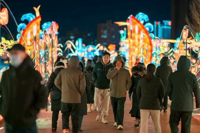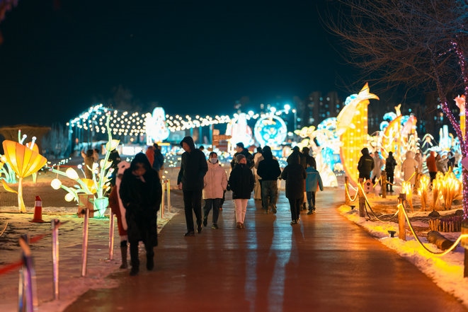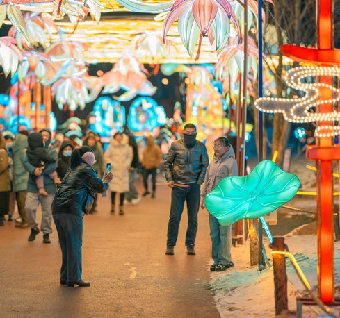 當(dāng)晚,呼和浩特零下15攝氏度左右,寒冷擋不住市民欣賞流光溢彩的燈會(huì),只見(jiàn)市民穿著保暖的外套,戴著帽子手套,一邊逛燈會(huì),一邊拍照片、拍視頻,還有的市民開(kāi)直播,與全國(guó)各地的網(wǎng)友一起分享這美好時(shí)刻。