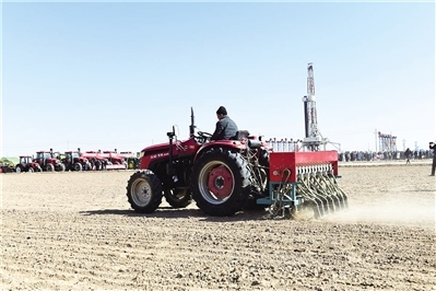 在臨河區(qū)狼山鎮(zhèn)光明村萬(wàn)畝小麥?zhǔn)痉秷@區(qū),幾十輛大型農(nóng)機(jī)具整齊排列、蓄勢(shì)待發(fā)?!伴_(kāi)播!”隨著光明村黨支部書(shū)記、糧食種植大戶(hù)代表郭成剛一聲號(hào)令,農(nóng)機(jī)手駕駛著播種機(jī)奔向沃野,伴著機(jī)械轟鳴,犁刀入地,一粒粒小麥種子被覆進(jìn)土中。