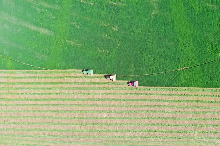 2023年6月4日,在土默特左旗國家現(xiàn)代農業(yè)示范區(qū)內,機械車輛在收割苜蓿(無人機照片)。新華社記者劉磊攝