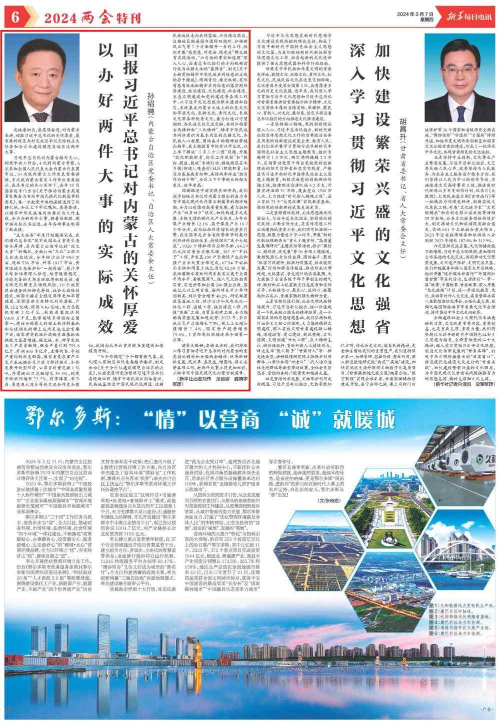 “七個作模范”個個都有新氣象。我們深入貫徹總書記重要指示要求,制定出臺《關于全方位建設模范自治區(qū)的決定》,從感黨恩聽黨話緊跟習近平總書記奮進新征程、鑄牢中華民族共同體意識、民族地區(qū)推進中國式現(xiàn)代化建設、邊疆民族地區(qū)走向共同富裕、興邊穩(wěn)邊固邊、邊疆地區(qū)聯(lián)通國內國際雙循環(huán)、弘揚新風正氣等7個方面鋪開一系列工作。組織開展“感黨恩、聽黨話、跟黨走”群眾教育實踐活動,“六句話的事實和道理”深入人心,沿著總書記指引的方向砥礪前行成為北疆大地的“最強音”。制定《關于全面貫徹鑄牢中華民族共同體意識主線的若干措施》,明確責任、健全機制,有形有感有效地把鑄牢共同體意識落實到經濟建設、政治建設、文化建設、社會建設、生態(tài)文明建設和黨的建設等各項工作中。以習近平文化思想為根本遵循和指引,系統(tǒng)集成內蒙古大地上的紅色文化和草原文化、農耕文化、黃河文化、長城文化等各種優(yōu)秀文化,著力打造以守望相助、各民族交往交流交融、共同弘揚蒙古馬精神和“三北精神”、鑄牢中華民族共同體意識為基本內容的北疆文化,各民族人心凝聚、團結奮斗的精神紐帶越扎越牢。在主題教育中抓實以學正風,以上率下解決“三多三少三慢”問題,開展“優(yōu)化職能職責、優(yōu)化工作流程”和“提標、提速、提效”專項行動,精減規(guī)范蘇木鄉(xiāng)鎮(zhèn)(街道)、嘎查村(社區(qū))職能職責、切實為基層減負松綁,連續(xù)兩年評選“擔當作為好干部”,全區(qū)上下干事創(chuàng)業(yè)的勁頭更足、效率更高。