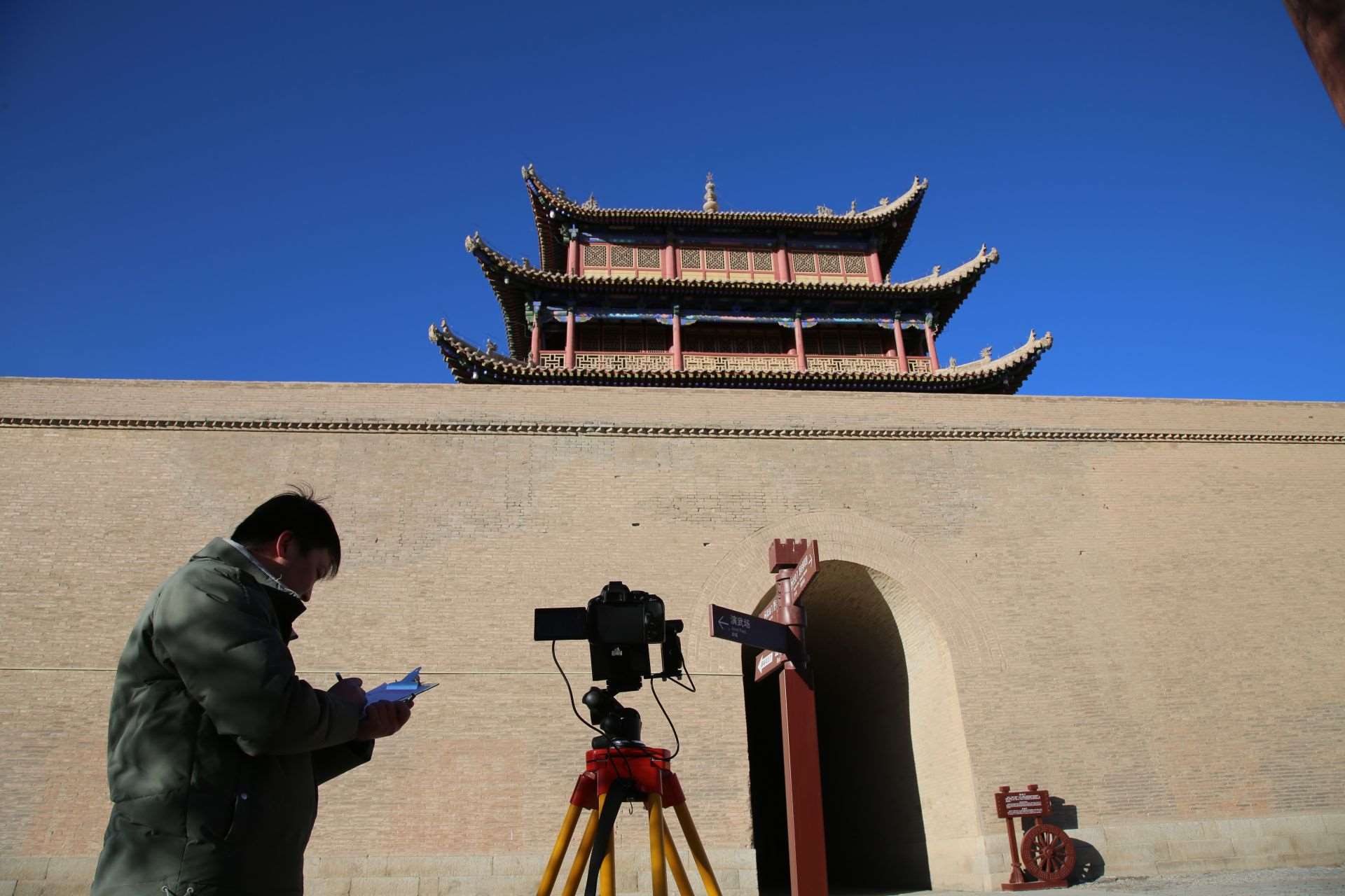 1月29日,嘉峪關(guān)絲路(長城)文化研究院文化遺產(chǎn)監(jiān)測中心工作人員高商,正在對柔遠樓城臺裂縫進行定期監(jiān)測。戈壁上的風很“硬氣”,高商寫字的手有點不聽使喚:“當長城醫(yī)生可不能偷懶,‘定期查體’都要做得仔仔細細,這樣才能及時‘防病治病’?!蓖略谏砗笄那陌聪驴扉T,高商渾然不覺。
