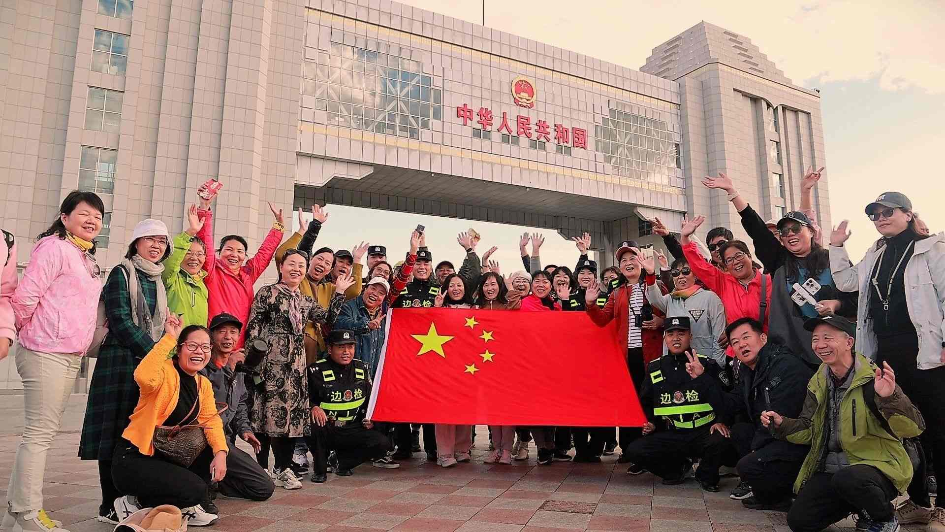 游客在滿(mǎn)洲里國(guó)門(mén)下合影。李新軍攝