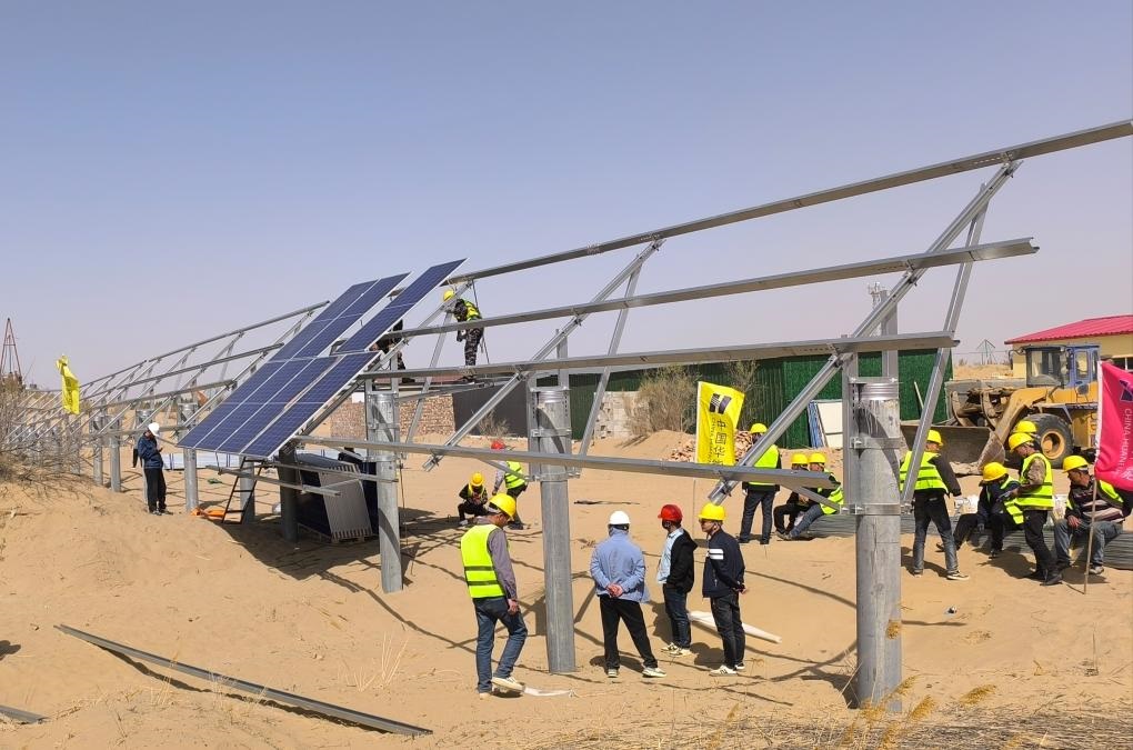 記者在新華林場(chǎng)民樂(lè)作業(yè)區(qū)看到,與其他作業(yè)區(qū)的造林治沙方式相比,這里既沒(méi)有栽樹,也沒(méi)有種草,而是在沙地里“栽”下了一個(gè)個(gè)水泥樁。葛文斌告訴記者:“這里是防沙治沙和風(fēng)電光伏一體化工程項(xiàng)目區(qū)?!浴鄻毒褪菫楹笃诎惭b光伏板、建設(shè)光伏電站做準(zhǔn)備。在光伏板上發(fā)電的同時(shí),我們還可以在光伏板下種植固沙植物,幫助地表植被恢復(fù),達(dá)到既能發(fā)電‘生金’又能實(shí)現(xiàn)沙化土地縮減的雙重功效?!保ㄓ浾呃钤破健⒑罹S軼)