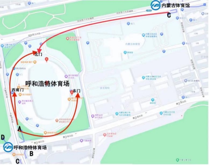 由呼和浩特體育場(chǎng)站A口、D口出站,沿氣象局西路向北直行可抵達(dá)呼和浩特體育場(chǎng)西門安檢處。