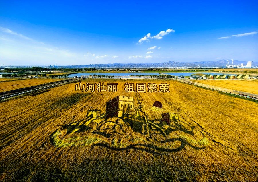 據(jù)講解員介紹,稻田畫(huà)種植,需要經(jīng)過(guò)彩稻選育、圖案設(shè)計(jì)、定點(diǎn)測(cè)繪、人工栽種、田間管理等環(huán)節(jié)。在栽種時(shí),要借助GPS定位插桿、牽線(xiàn)、畫(huà)輪廓,之后才能在相應(yīng)的位置插秧。這兩幅水稻畫(huà),在不同的季節(jié),會(huì)呈現(xiàn)不同的色彩和景致。在中華人民共和國(guó)成立75周年到來(lái)之際,共同祝福偉大祖國(guó)繁榮昌盛。