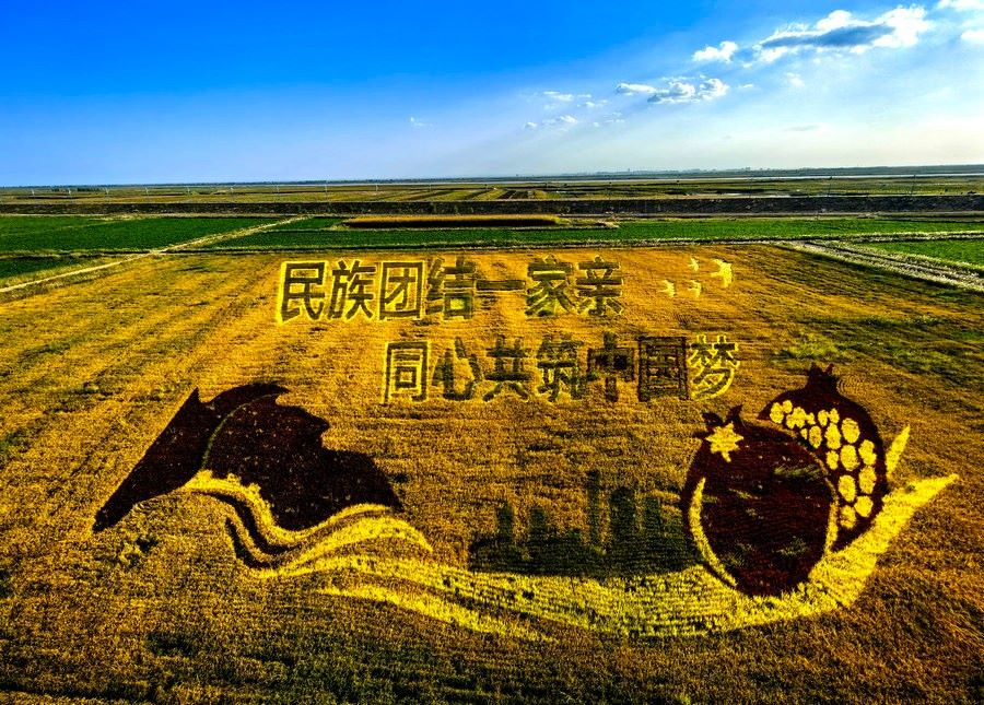 9月26日,內(nèi)蒙古包頭市東河區(qū)沙爾沁鎮(zhèn)什大股村,金色的稻浪掩映下,一幅壯美的稻田畫(huà),在金秋時(shí)節(jié)格外引人注目。