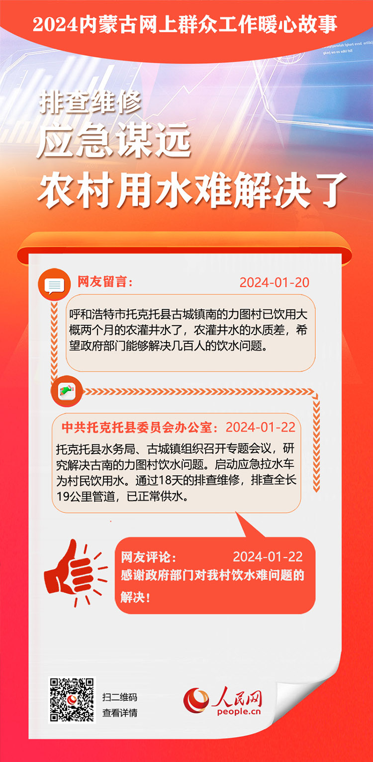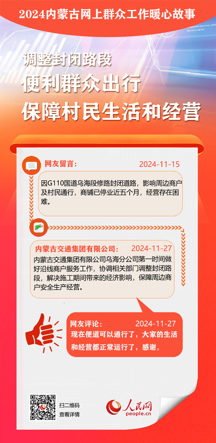 走好走實網(wǎng)上群眾路線 用心用情為民服務(wù)辦實事。依托人民網(wǎng)“領(lǐng)導(dǎo)留言板”,內(nèi)蒙古自治區(qū)各級黨委、政府著力解決網(wǎng)民反映的熱點難點。2024年,一批群眾關(guān)切的急難愁盼問題得到及時解決。人民網(wǎng)內(nèi)蒙古頻道推出特別策劃,盤點過去一年內(nèi)蒙古網(wǎng)上群眾工作那些暖心事。