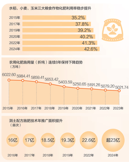 2024年,我國水稻、小麥、玉米三大糧食作物化肥利用率為42.6%,比2022年提高1.3個百分點?;世寐剩椿时蛔魑镂绽玫谋壤?,反映了化肥在農(nóng)業(yè)生產(chǎn)中的有效利用程度??茖W(xué)施肥效果提升,折射農(nóng)業(yè)發(fā)展方式之變。