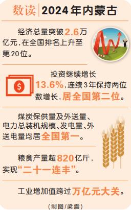 2024年,內蒙古完成防沙治沙面積1954萬畝;新能源建設領跑全國,煤炭保供量及外送量、電力總裝機規(guī)模、發(fā)電量、外送電量均居全國第一,稀土產業(yè)產值突破千億元;糧食產量超820億斤,實現“二十一連豐”;陸路口岸貨運量突破1.2億噸。