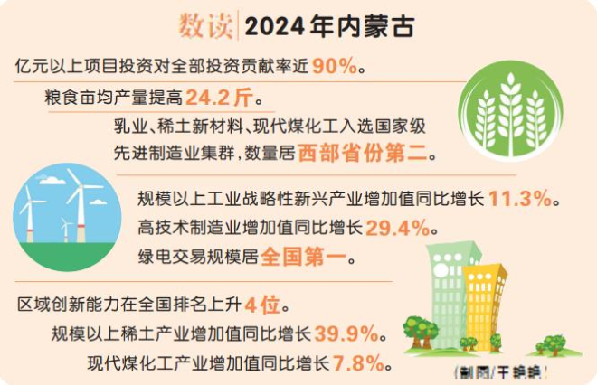 新賽道上,受益于高質(zhì)量重大項(xiàng)目帶動(dòng),2024年,自治區(qū)綠電交易規(guī)模居全國(guó)第一;“蒙科聚”平臺(tái)技術(shù)合同成交額同比增長(zhǎng)33.6%,全區(qū)凈增科技型中小企業(yè)853家、高新技術(shù)企業(yè)97家、科技領(lǐng)軍企業(yè)20家,乳業(yè)、稀土、氫、儲(chǔ)等領(lǐng)域取得一批填補(bǔ)行業(yè)空白的技術(shù)突破,我區(qū)區(qū)域創(chuàng)新能力在全國(guó)排名上升4位;全區(qū)規(guī)模以上新能源及相關(guān)產(chǎn)業(yè)增加值同比增長(zhǎng)20.1%,規(guī)模以上工業(yè)戰(zhàn)略性新興產(chǎn)業(yè)增加值同比增長(zhǎng)11.3%,高技術(shù)制造業(yè)增加值同比增長(zhǎng)29.4%……推動(dòng)新興產(chǎn)業(yè)“強(qiáng)筋壯骨”、未來(lái)產(chǎn)業(yè)加速培育,內(nèi)蒙古落子如飛!