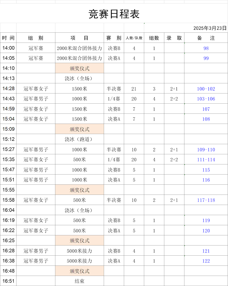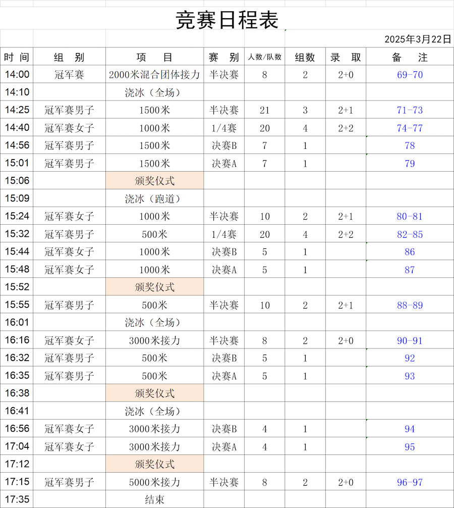 比賽項目包括男女500米、1000米、1500米以及接力賽等多個項目。