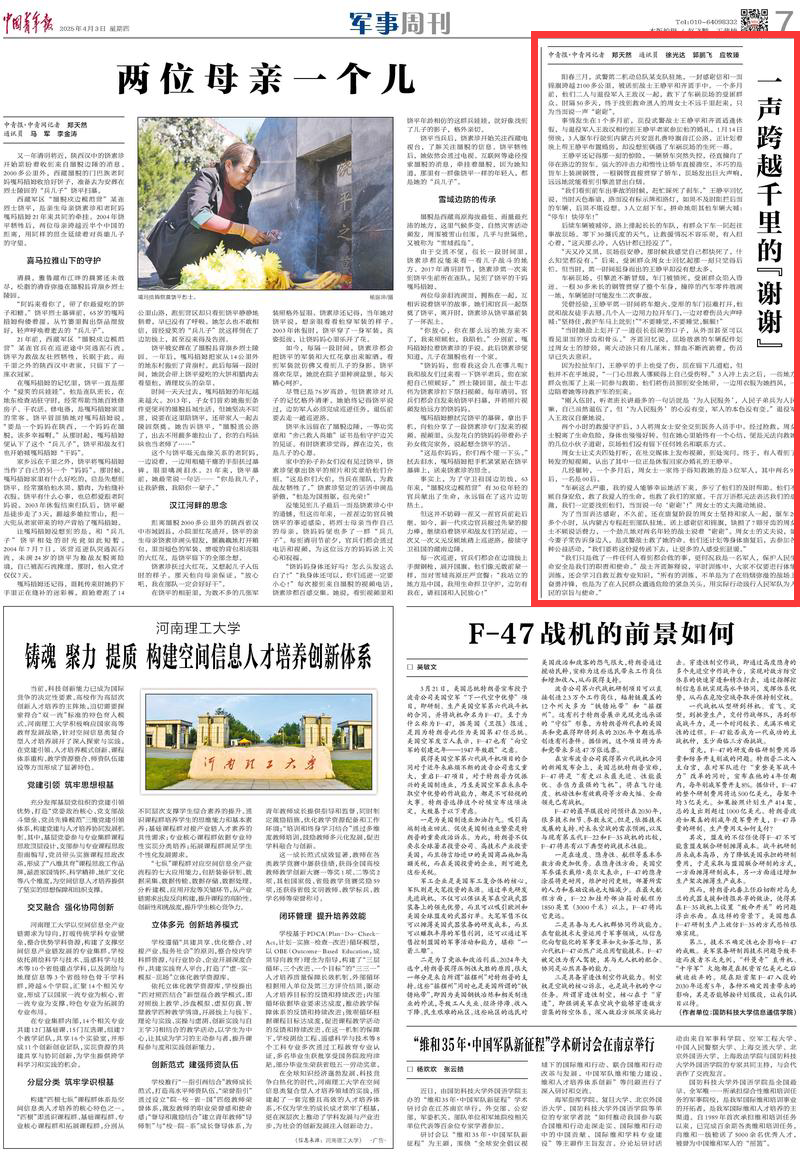 2025年4月3日,《中國青年報》第7版刊發(fā)題為《一聲跨越千里的“謝謝”》一文,報道了武警第二機(jī)動總隊(duì)某支隊(duì)駐地戰(zhàn)士王靜平和齊圓,收到跨越2100多公里的一封感謝信和一面錦旗。原來,一個多月前,他們二人與退役軍人王政漢一起,在內(nèi)蒙古興安盟扎賚特旗救下了車禍現(xiàn)場的受困群眾。時隔50多天,終于找到救命恩人的周女士不遠(yuǎn)千里趕來,只為當(dāng)面說一聲“謝謝”。