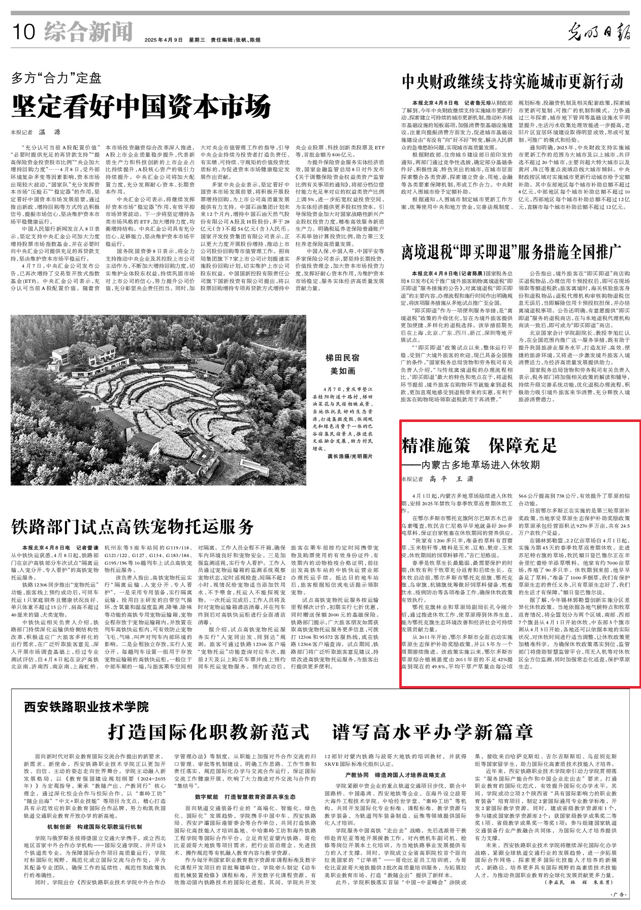 2025年4月9日,《光明日?qǐng)?bào)》第10版刊發(fā)題為《精準(zhǔn)施策 保障充足——內(nèi)蒙古多地草場(chǎng)進(jìn)入休牧期》的文章,報(bào)道了4月1日起,內(nèi)蒙古多地草場(chǎng)陸續(xù)進(jìn)入休牧期,安排2025年禁牧與春季牧草返青期休牧工作。