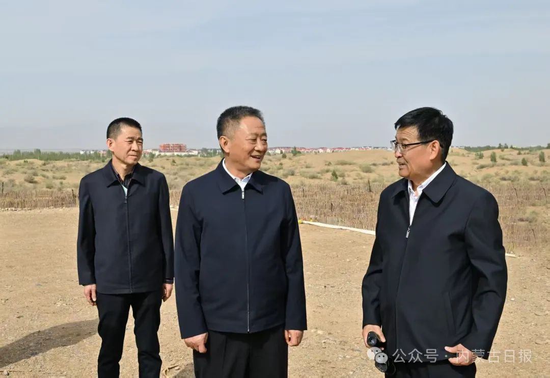 5月11日,自治區(qū)黨委書記孫紹騁在杭錦旗獨貴塔拉鎮(zhèn)沙日召嘎查重點了解庫布其沙漠北緣鎖邊林草帶布局和入黃泥沙減少、生態(tài)用水保障等情況。草原云·內蒙古新聞網(wǎng)記者