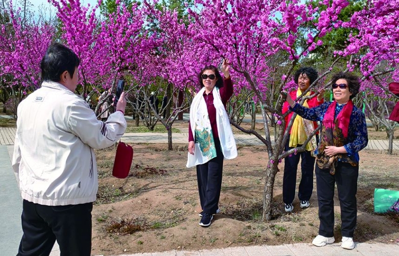 走進植物園,道路兩側(cè)的榆葉梅競相綻放,粉紅色的花朵層層疊疊掛滿枝頭,形成一片爛漫花海。從浙江來的游客李筱正用手機記錄美景:“原本擔(dān)心錯過北方花期,沒想到這里的榆葉梅開得這么漂亮,完全不輸江南的春天?!?/p>