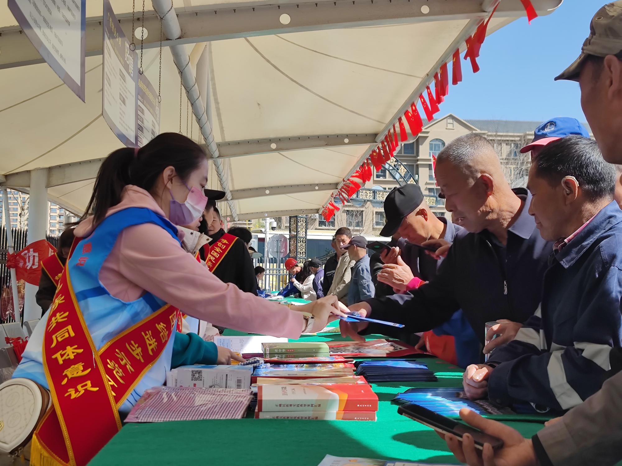 在烏海市海勃灣零工市場,工作人員向求職者發(fā)放黨的民族理論政策宣傳冊。