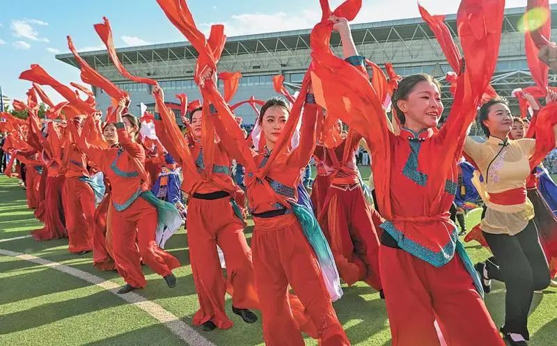內(nèi)蒙古師范大學的學生共同表演舞蹈節(jié)目。