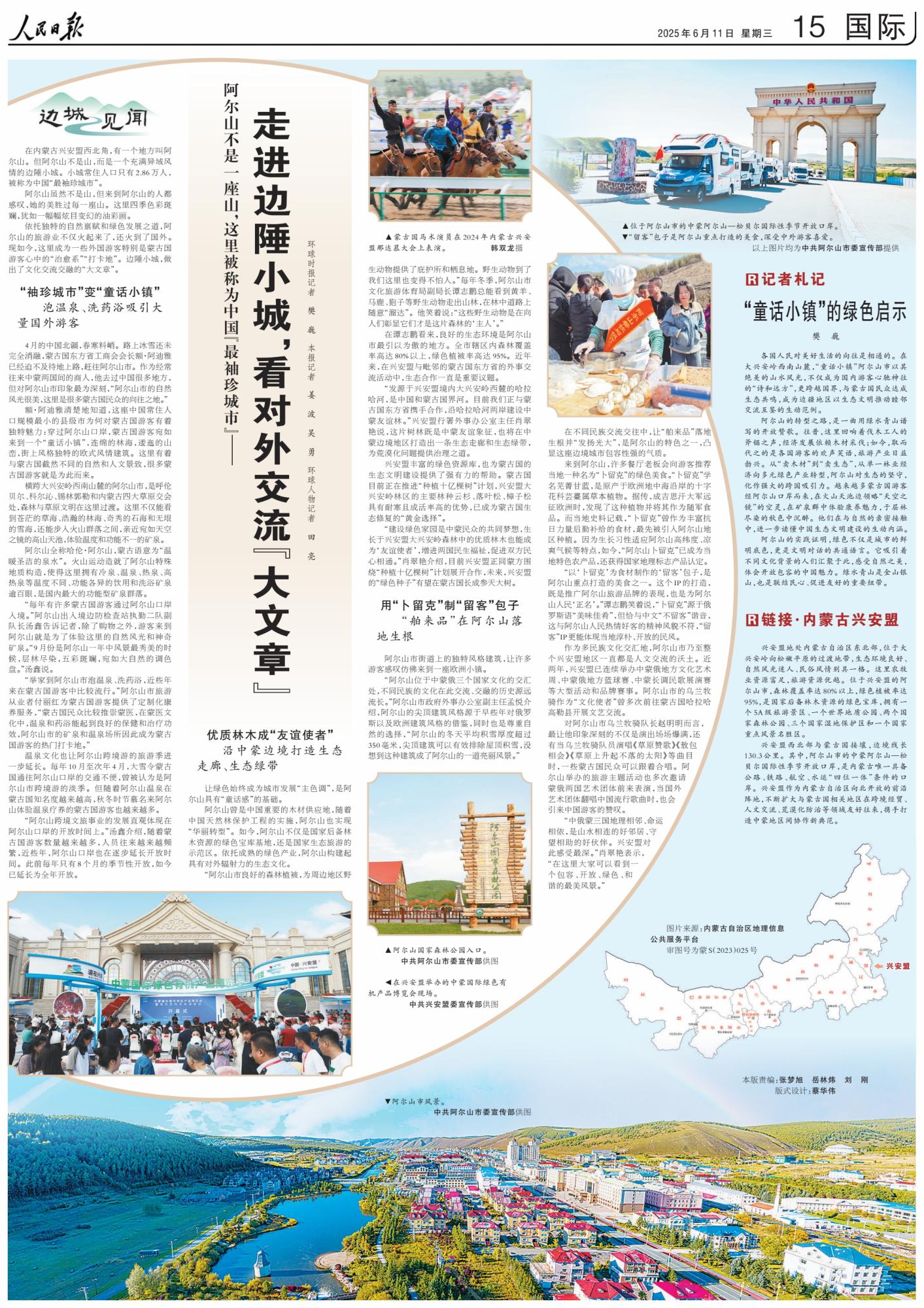 2025年6月11日,《人民日報》第15版刊發(fā)整版文章《阿爾山不是一座山,這里被稱為中國“最袖珍城市”——走進(jìn)邊陲小城,看對外交流“大文章”》,報道了依托獨特的自然稟賦和綠色發(fā)展之道,阿爾山的旅游業(yè)火起來了?,F(xiàn)如今,這里成為一些外國游客特別是蒙古國游客心中的“治愈系”“打卡地”。邊陲小城,做出了文化交流交融的“大文章”。