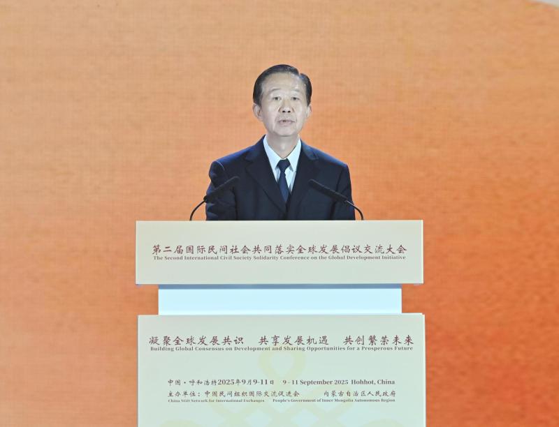 9月10日,全國人大常委會副委員長、中國民間組織國際交流促進會會長肖捷在第二屆國際民間社會共同落實全球發(fā)展倡議交流大會開幕式上作主旨講話。草原云·內(nèi)蒙古新聞網(wǎng)記者 馬建兵 攝