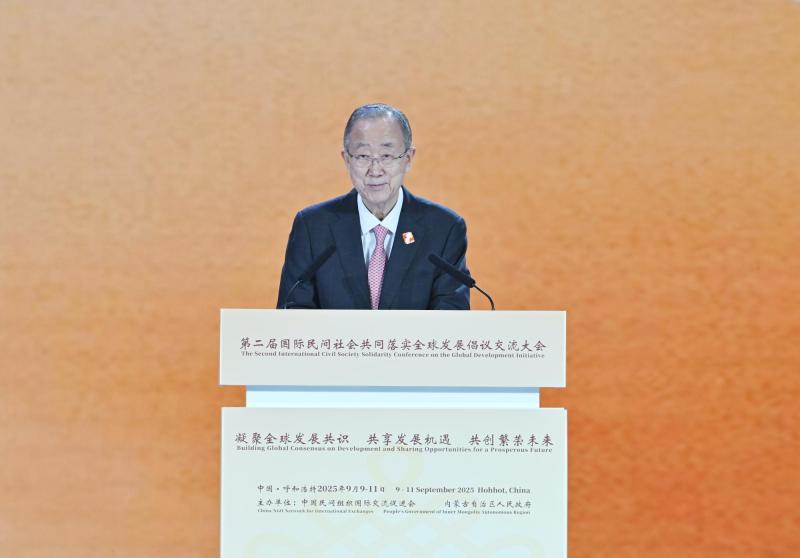 9月10日,聯(lián)合國第八任秘書長潘基文在第二屆國際民間社會共同落實全球發(fā)展倡議交流大會開幕式上致辭。草原云·內(nèi)蒙古新聞網(wǎng)記者 馬建兵 攝