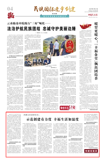 2025年9月23日,《中國(guó)民族報(bào)》第4版刊發(fā)題為《內(nèi)蒙古巴彥淖爾市:示范創(chuàng)建有力度 幸福生活加溫度》的文章,報(bào)道了2023年6月,習(xí)近平總書(shū)記在內(nèi)蒙古自治區(qū)考察調(diào)研時(shí),首次提出“鑄牢中華民族共同體意識(shí)是新時(shí)代黨的民族工作的主線,也是民族地區(qū)各項(xiàng)工作的主線”。巴彥淖爾市始終牢記囑托,將“鑄牢”貫穿于想問(wèn)題、作決策、干工作的全過(guò)程。