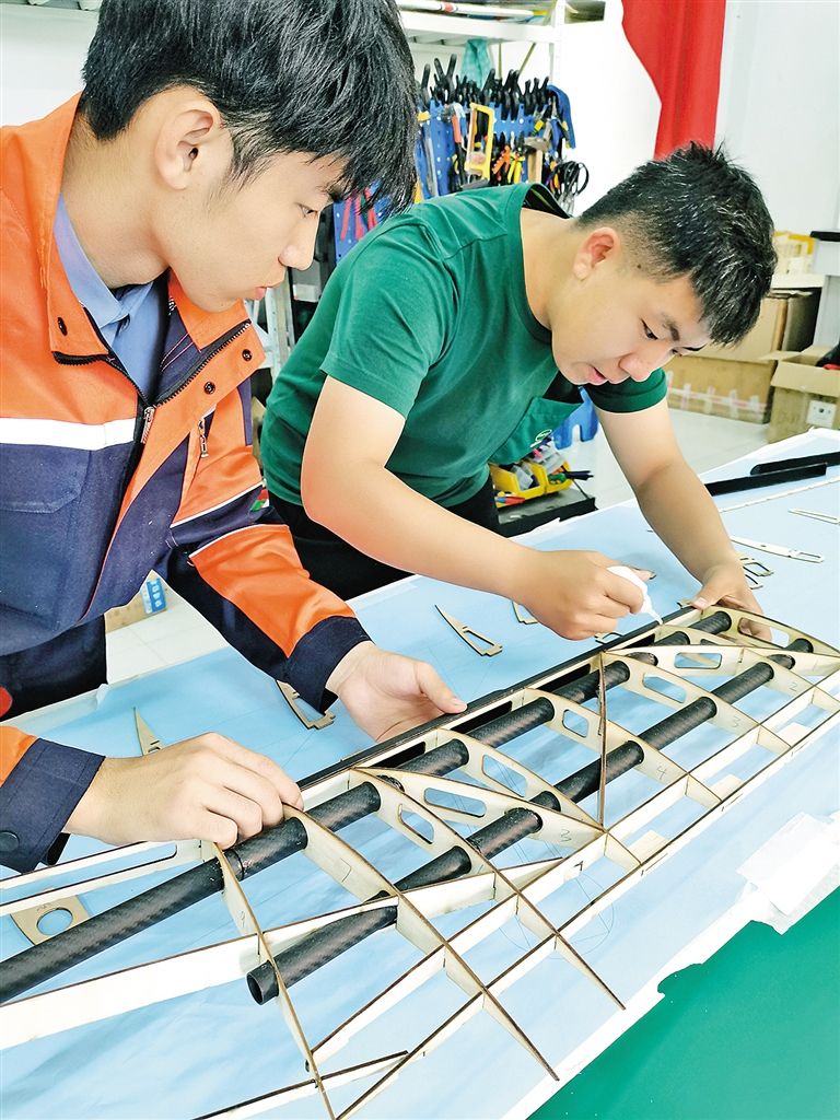內(nèi)蒙古工業(yè)大學(xué)智能裝備研究院工作人員正在進(jìn)行TS300長航時大載重固定翼無人運輸機(jī)室內(nèi)組裝工作。