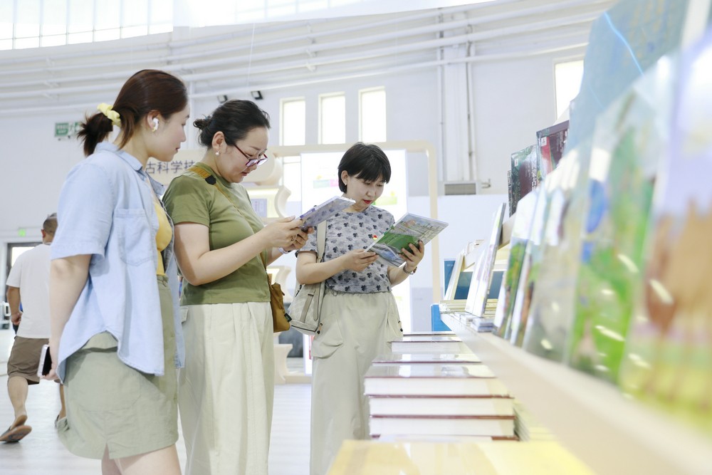 讀者在內(nèi)蒙古出版集團展區(qū)閱讀圖書