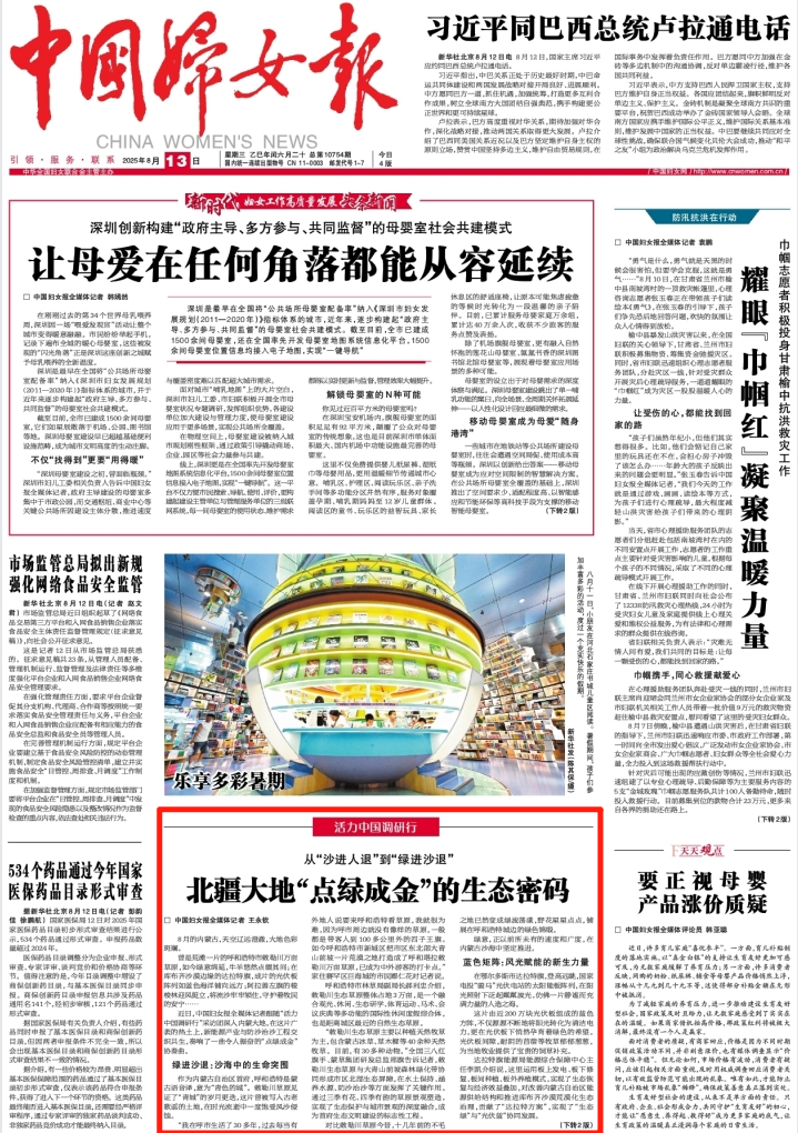 2025年8月13日,《中國婦女報》第1版刊發(fā)題為《從“沙進(jìn)人退”到“綠進(jìn)沙退” 北疆大地“點(diǎn)綠成金”的生態(tài)密碼》的文章,報道了“活力中國調(diào)研行”采訪團(tuán)深入內(nèi)蒙古大地,在這片廣袤的熱土上,新能源產(chǎn)業(yè)與防沙治沙工程交織共生,奏響了一曲令人振奮的“點(diǎn)綠成金”協(xié)奏曲。