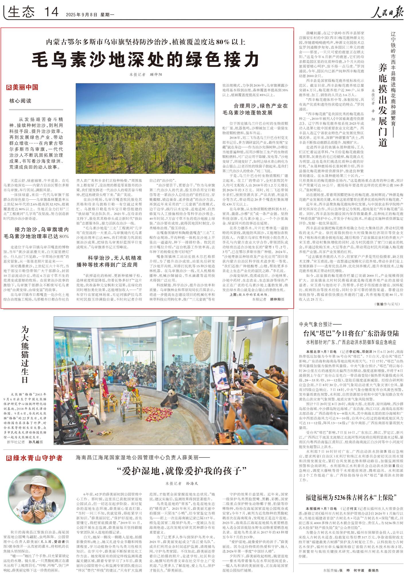2025年9月8日《人民日?qǐng)?bào)》第14版刊發(fā)了《內(nèi)蒙古鄂爾多斯市烏審旗堅(jiān)持防沙治沙,植被覆蓋度達(dá)80%以上 毛烏素沙地深處的綠色接力》的文章,報(bào)道了在內(nèi)蒙古鄂爾多斯市烏審旗,一代代治沙人不斷鞏固拓展治理成果,書寫著沙海變綠洲、荒漠成良田的動(dòng)人故事。沙地林果、沙地中藥材、生態(tài)農(nóng)業(yè)、生態(tài)旅游等綠色產(chǎn)業(yè)正在廣袤的毛烏素沙地上蓬勃發(fā)展,煥發(fā)出綠水青山就是金山銀山的勃勃生機(jī)。
