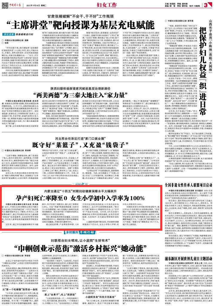 2025年11月18日《中國(guó)婦女報(bào)》第3版刊發(fā)了《內(nèi)蒙古通遼“十四五”時(shí)期婦幼健康保障水平大幅躍升 孕產(chǎn)婦死亡率降至0 女生小學(xué)初中入學(xué)率為100%》的文章,報(bào)道了近年來(lái),通遼市婦幼健康保障水平大幅躍升,孕產(chǎn)婦死亡率降至0,嬰兒死亡率降至2.28‰。婦女“兩癌”篩查成效顯著,完成50萬(wàn)人次免費(fèi)篩查,1461名低收入患病婦女獲得全額救助。聯(lián)合醫(yī)療部門開(kāi)展的講座和義診惠及10萬(wàn)余名婦女群眾。