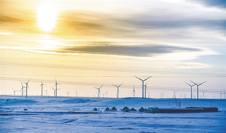 湛藍(lán)天幕之下,150座白色風(fēng)車如鋼鐵巨人般巍然矗立,巨大的風(fēng)機(jī)葉片迎風(fēng)轉(zhuǎn)動,劃破長風(fēng),發(fā)出低沉而均勻的呼嘯,與天地間的遼闊寂靜共鳴。