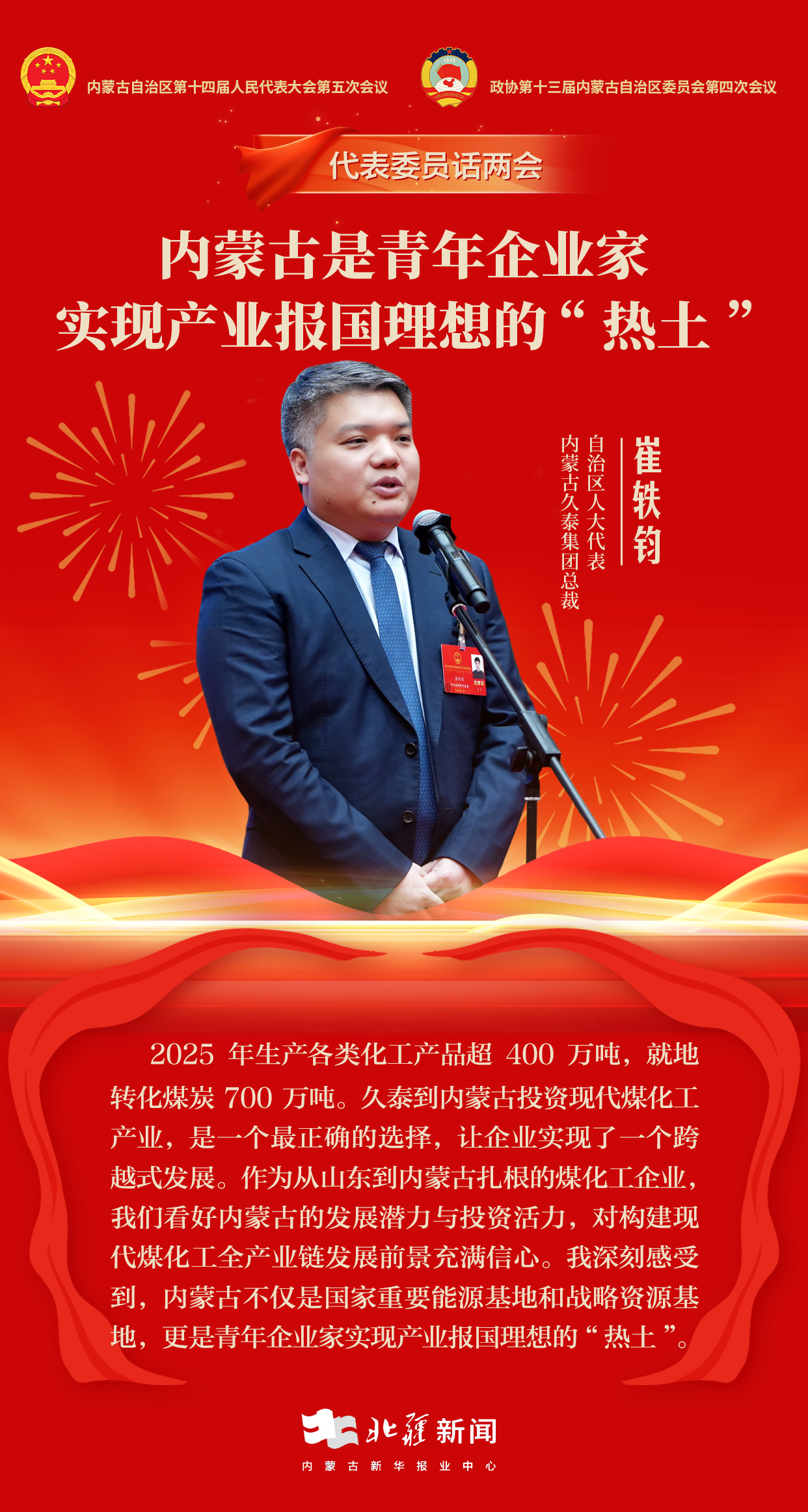 作為扎根內(nèi)蒙古的青年企業(yè)家,崔軼鈞表示,他深刻感受到內(nèi)蒙古不僅是國家重要能源和戰(zhàn)略資源基地,更是青年企業(yè)家實現(xiàn)產(chǎn)業(yè)報國理想的“熱土”。