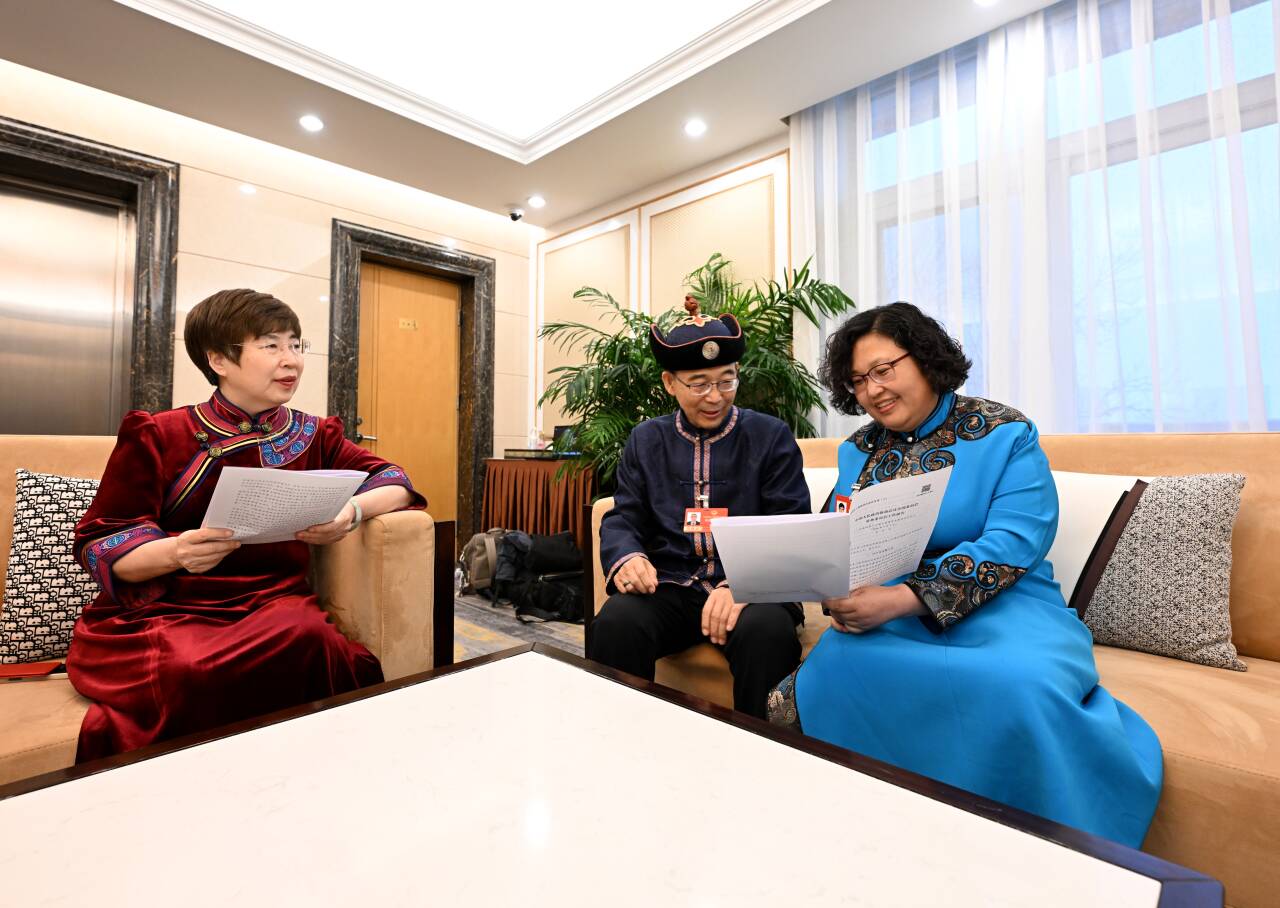 3月4日,住內(nèi)蒙古全國政協(xié)委員杜明燕(右)、納日碧力戈(中)、鄂曉梅(左)就全國政協(xié)常委會工作報告中共同關(guān)注的話題進行交流。草原云記者 韓卿立