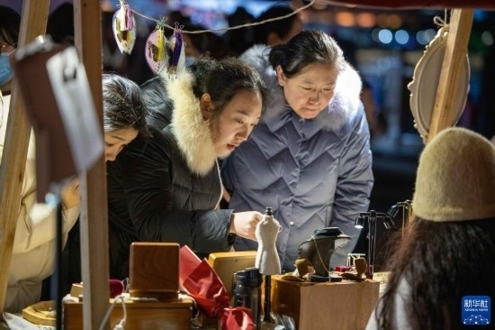 2月15日,游客在寧波老外灘步行街夜集市上挑選飾品。