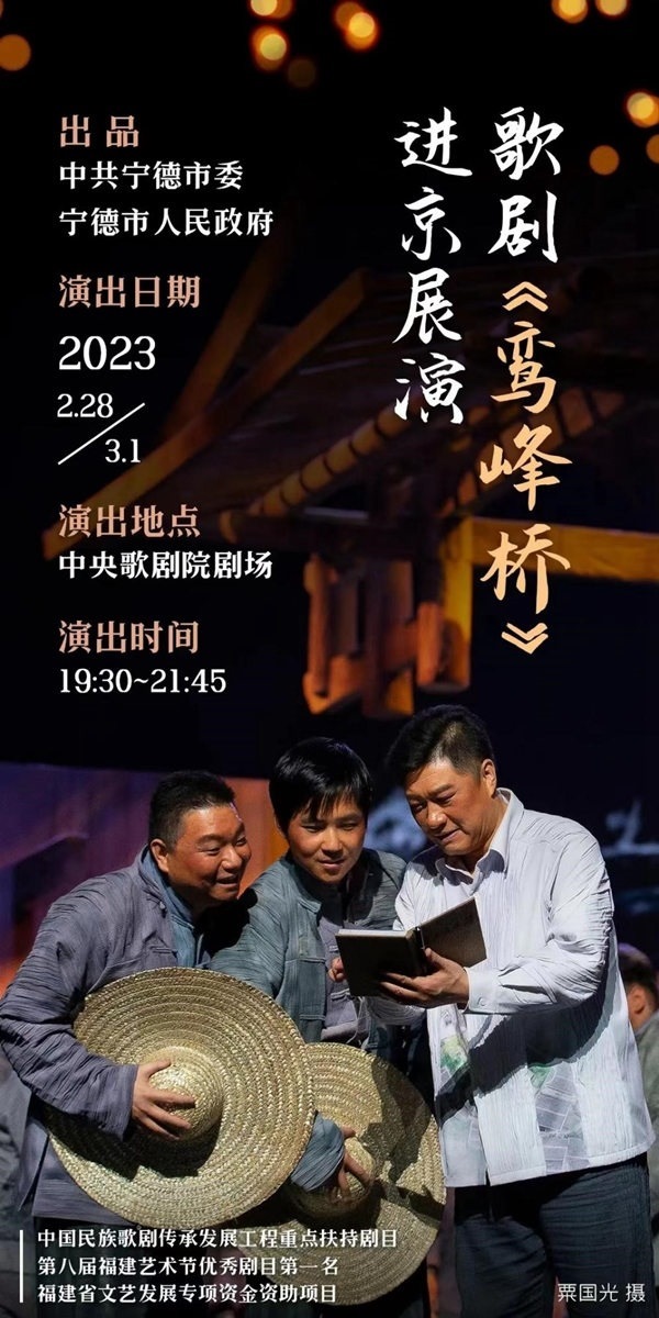 人民網(wǎng)福州2月27日電 (劉卿)日前,文化和旅游部公布“新時代舞臺藝術(shù)優(yōu)秀劇目展演”進京集中示范演出劇目,由中共寧德市委、寧德市人民政府出品的歌劇《鸞峰橋》入選。據(jù)了解,該劇將于2月28日至3月1日每晚19:30至21:45在中央歌劇院劇場進行展演。