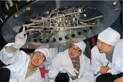 布面油畫《知難而進 眾志成城》原型為新華社記者王呈選拍攝的一幅新聞照片,畫面為20世紀80年代末清華大學核能與新能源技術研究院王大中、馬昌文、董鐸正在進行5兆瓦低溫核反應堆調試的場景。作品生動地刻畫了以國家最高科學技術獎獲得者王大中院士等為代表的清華教師勇于承擔國家重大科技項目,知難而進、眾志成城的寶貴精神。