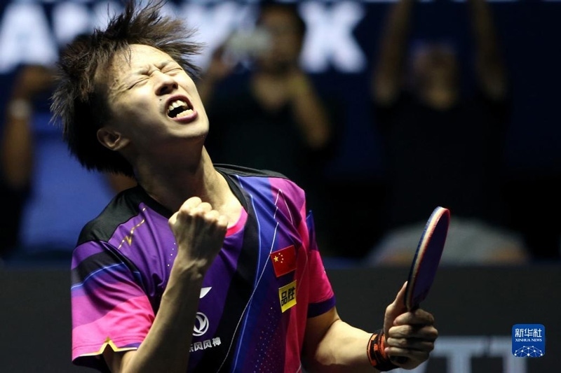 2023年4月14日,梁靖崑在比賽中慶祝得分。當(dāng)日,在河南新鄉(xiāng)舉行的世界乒乓球職業(yè)大聯(lián)盟(WTT)新鄉(xiāng)冠軍賽男單半決賽中,中國(guó)選手梁靖崑以4比2戰(zhàn)勝中國(guó)臺(tái)北選手林昀儒,晉級(jí)男單決賽。新華社記者 李嘉南攝