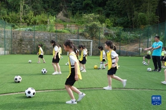 5月25日,小學(xué)生在足球場練習(xí)足球。
