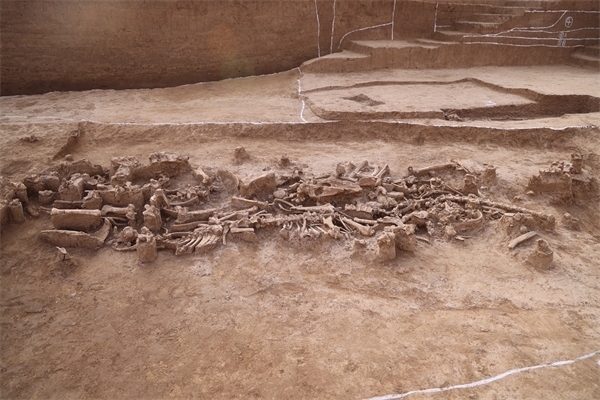 在“郭城”東南拐角處,發(fā)現(xiàn)一條殷墟時期的大型祭祀溝,長達19.36米,溝內(nèi)堆疊了3層人骨及動物骨骼,初步清理出完整的人骨3具,以及肢解的牛骨、豬骨、馬骨、鳥骨等,經(jīng)動物考古學家辨認至少分屬17個動物個體。考古勘探還發(fā)現(xiàn)不同時期的道路遺跡穿過城壕,為探討洹北商城內(nèi)外部交通路網(wǎng)提供了重要線索。