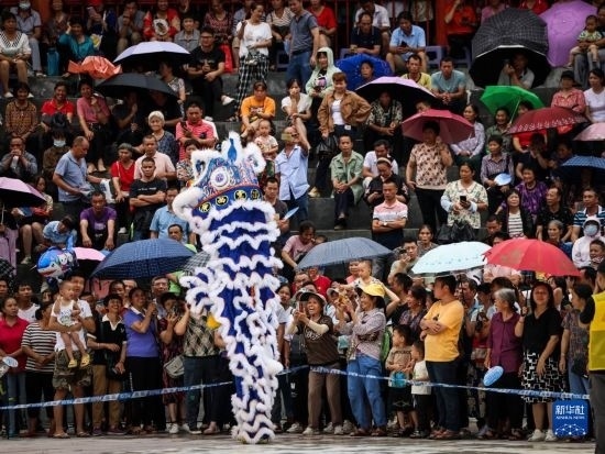 6月27日,在廣西環(huán)江毛南族自治縣下南鄉(xiāng)毛南民族文化園,村民觀看舞獅表演。