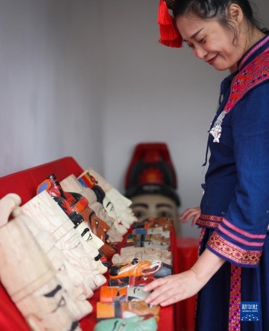6月27日,在廣西環(huán)江毛南族自治縣下南鄉(xiāng)毛南民族文化園,身著毛南族服飾的婦女觀賞毛南族儺面具。