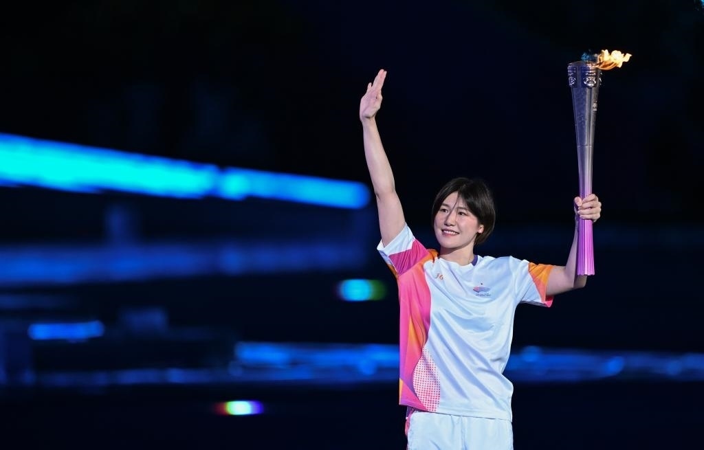第一棒火炬手葉詩文高擎亞運火炬入場,樊振東、徐夢桃、石智勇、李玲蔚、汪順5名火炬手接力奔跑,他們都曾在國際體育舞臺取得驕人成績。場外,光影匯聚而成的“數(shù)字火炬手”出現(xiàn)在杭城夜空。